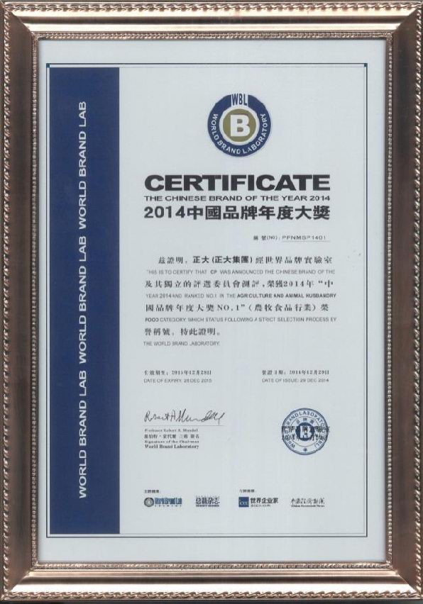 2014年12月29日,“總裁世界年會”在北京東方君悅大酒店舉行。本次大會揭曉了享有“中國品牌奧斯卡”之稱的 “世界品牌實驗室2014年中國品牌年度大獎”評選結(jié)果,正大集團(tuán)、中國國航、國家電網(wǎng)、騰訊控股、中國人壽、中國國旅、北汽集團(tuán)、華為技術(shù)、長虹電器等30個活躍在中國經(jīng)濟舞臺的領(lǐng)軍品牌榮獲 “中國品牌年度大獎”,正大集團(tuán)以在農(nóng)牧食品業(yè)多年的探索實踐和管理經(jīng)驗,以及良好的產(chǎn)品品質(zhì)和品牌知名度,榮獲農(nóng)牧食品行業(yè)“中國品牌年度大獎***”榮譽稱號。哈佛商學(xué)院教授約翰?戴騰博士(John Deighton)、耶魯大學(xué)管理學(xué)院教授萊維·多爾博士(Ravi Dhar)分別進(jìn)行頒獎及致詞。